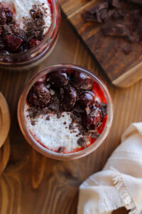 Cherries and chocolate – a match made in heaven and perfect for when you want your breakfast to feel like dessert. This chia pudding with cherries and chocolate is a healthy protein packed meal with natural sweetness and luxurious flavors. aka a healthy way to treat yourself. Let’s get started… This one is super easy! Start by whisking a cup of Greek yogurt (you can use plain or vanilla here) with a cup of your favorite milk, 1/2 cup of chia seeds, 2 tablespoons of honey, agave or pure maple syrup and a teaspoon of pure vanilla extract. Chill the mixture in an airtight container for a minimum of an hour, but overnight will give you the best texture. You can use fresh of thawed cherries here, but I actually prefer the frozen ones. They are already pitted (less work for us) and they are all tender and juicy once