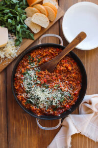 As an Italian, I am often overcome with a strong craving for certain Italian flavors. For me, this is the combination of beef, garlic, onions, tomatoes and parm. Spaghetti, meatballs, stuffed shells and lasagna all come to mind, but if these cravings visit on a busy weeknight… I am making this ground beef and orzo skillet… This skillet is filed with ground beef, garlic, onions, tomatoes, peppers, herbs and orzo and it gives all of those comforting, cozy vibes in just around 30 minutes. This recipe creates a big skillet that easily feeds 8 or creates a weeks worth of meal preps for me and my husband. It it super easy to cut in half if you just want to make dinner for tonight, but I always make the full batch to make sure we have delicious leftovers all week long. Let’s get started… Begin by browning 2 pounds of