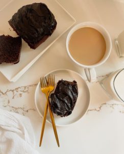 Carefully mix the coffee into the batter and transfer the batter into a well greased parchment lined baking dish. The batter will be pretty loose, so it pours beautifully. I usually bake this cake in a 9″x5″ loaf pan, but it will work good in an 8″ or 9″ round or square baking pan too. You could also bake two 4 inch round cakes to make a mini layer cake. Adorable, right?