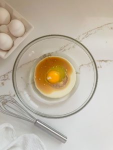 Begin by whisking a large egg with 1/4 cup of vegetable oil and 1/4 cup of whole milk until the egg is completely broken down.