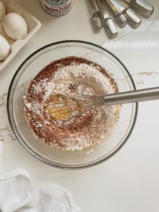 - Add 1 cup of cake or all purpose flour, 1/4 teaspoon of baking soda, 3/4 teaspoon of baking powder, 3 tablespoons of natural unsweetened cocoa powder and a pinch of salt and whisk until mostly combined