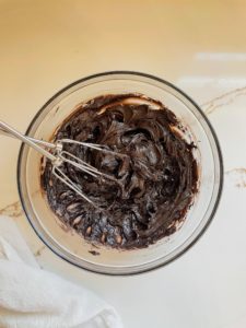 - Make the frosting by creaming a tablespoon of room temperature butter with 1/4 cup of cold heavy cream, 1/2 teaspoon of vanilla extract, 2 tablespoons of cocoa powder and 1 1/4 cup of confectioners sugar with an electric hand mixer until you have a creamy chocolatey frosting.