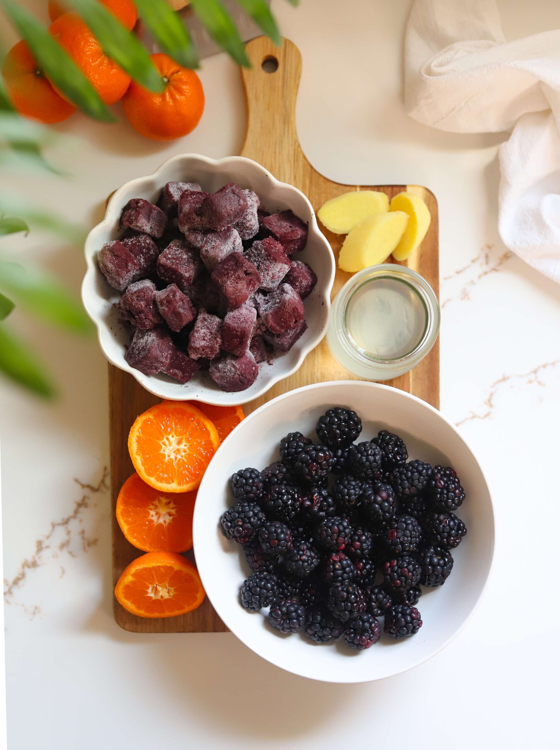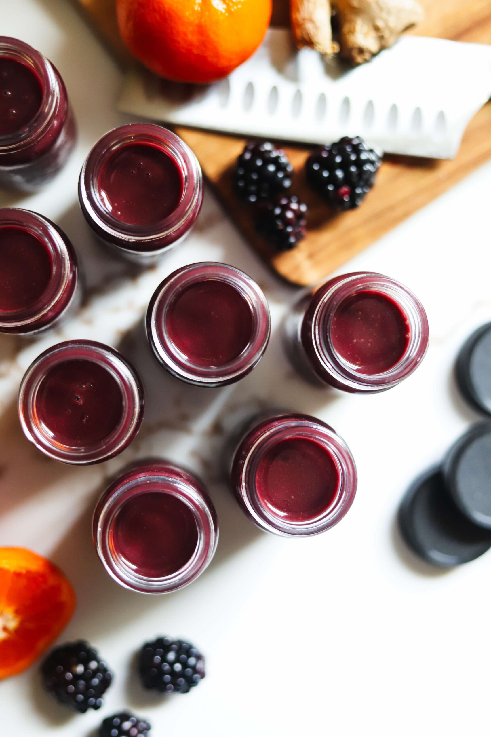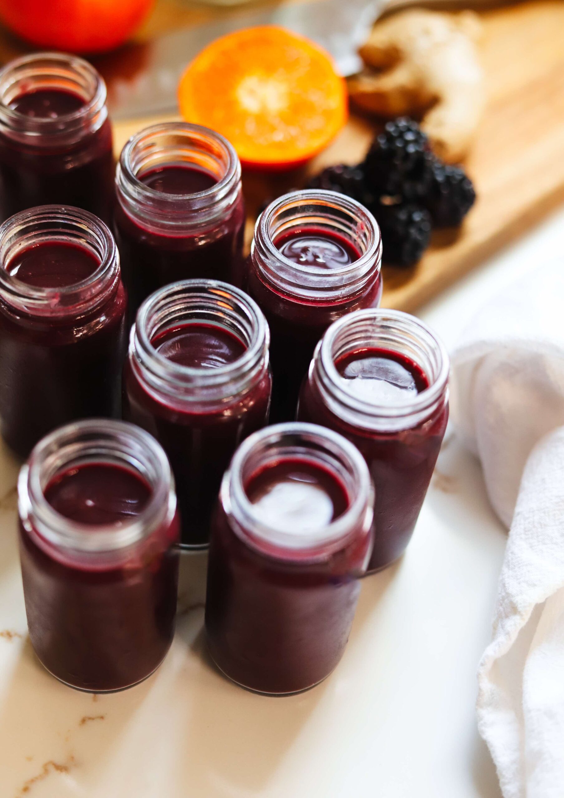 These açaí blackberry ginger and orange wellness shots are really quite tasty (even with a good amount of fresh ginger added in!) and they are packed with so many health benefits that I genuinely look forward to cracking open my fridge first thing in the morning and downing one of these cheerful little shots.