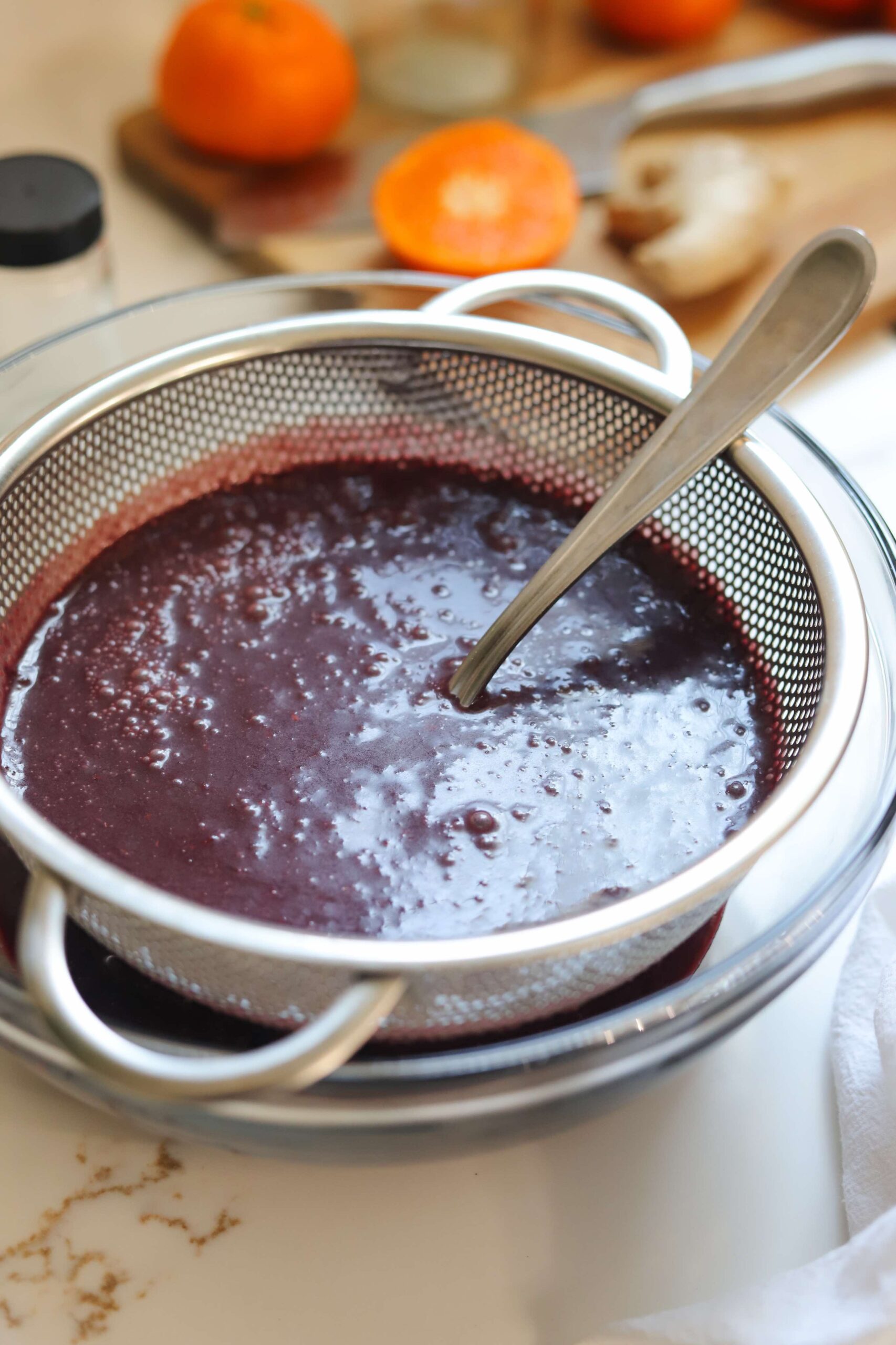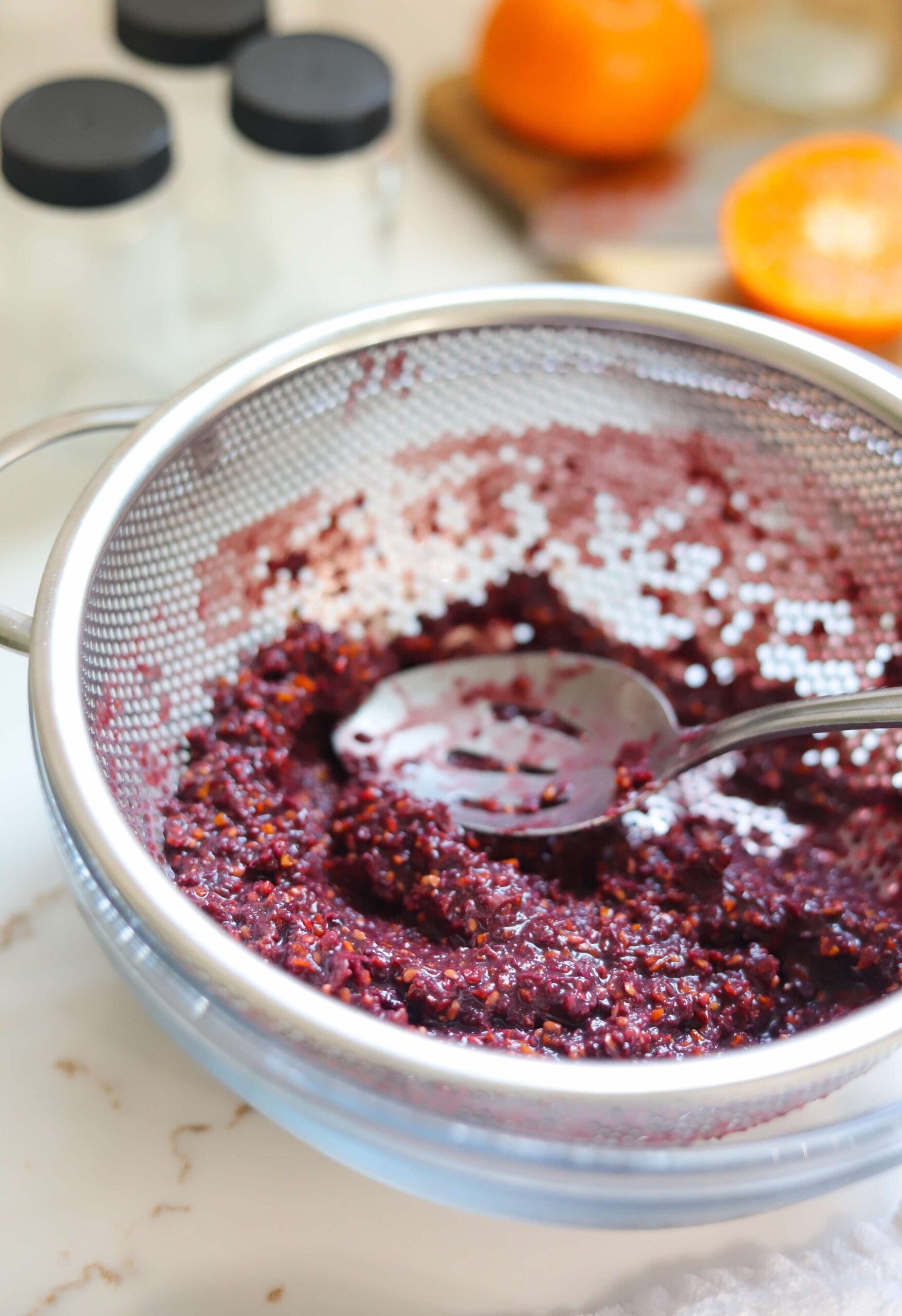The easiest way to strain the mixture is either with a piece of cheesecloth or by placing a fine mesh strainer over a big bowl. Use a spoon to press as much of the liquid out of the mixture as possible until you are left with small bits of orange peel and blackberry seeds.