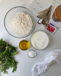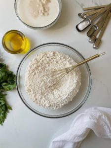 - In a large bowl, add 2 1/2 cups of bread flour, a teaspoon of salt and 1/3 cup of olive oil