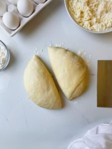 Use a dough scraper or sharp knife to divide the dough into 2 or 4 equal portions. This recipe can make 2 large khachapuri or 4 smaller sized ones.