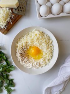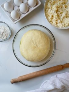 - While dough is resting, combine 7 ounces of soft farmers cheese with 8 ounces of shredded mozzarella, 1 large egg and a pinch of salt and black pepper and set aside for now