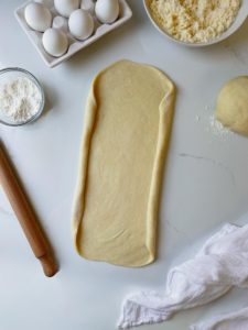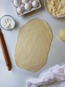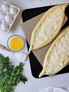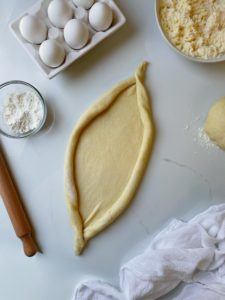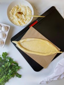 If you are making 2 large khachapuri, this oval should be about 12 inches in length and if you are making 4 smaller portions, your ovals should be about 8-9 inches in length.