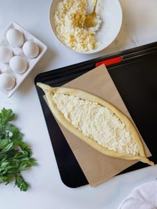 I like to transfer the shaped dough onto sheets of parchment paper, but khachapuri can be baked directly on a good quality non-stick baking sheet.