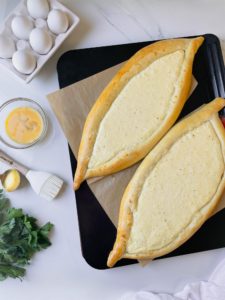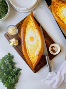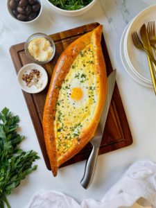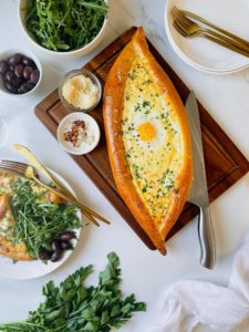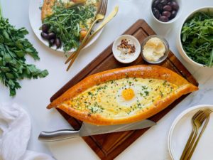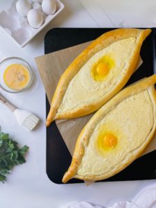 There are several different versions of khachapuri and today we are making the adjaruli version, which originates from the region of Adjaria in Georgia. This version looks like a little bread boat filled with cheese, but there are actually 11 different types of khachapuri ranging from cheese and other fillings baked completely enclosed in bread to flaky layered versions using a bread dough that is closer to puff pastry than pizza dough.