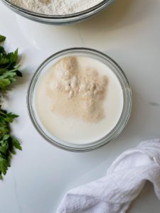 If you have never worked with yeast before, it is really easy and actually tells you when it is ready to go, which is nice right? Yeast needs 2 things to “bloom” or wake up. It needs warmth and a snack, so whisk a 7 gram envelope of active dry yeast into a cup of warm milk with a tablespoon of granulated sugar. Let it sit for 5-10 minutes and as soon as you see foamy bubbles form over the surface of the milk, the yeast is ready to get to work.