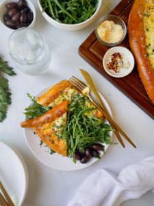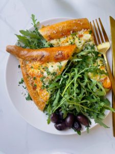 While khachapuri stands well on its own, I like pairing it with some lightly dressed greens and a few olives, but it can really be paired with anything! A full on salad, some pesto, spicy marinara, cured meats… cheese and bread go with everything, so pair away!