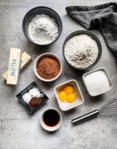 Begin by gathering 2 cups of all purpose flour, 2/3 cup of unsweetened cocoa powder, 1 cup of cornstarch, 1 teaspoon of espresso powder, 1 teaspoon of baking powder, 1/2 teaspoon of salt, 14 tablespoons of room temperature butter, 2/3 cup of granulated sugar, 3 large egg yolks, 2 tablespoons of whole milk and 2 teaspoons of vanilla extract.