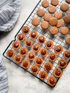Bake the chilled cookies in a 350 degree oven for 8 minutes and then carefully transfer them onto a cooling rack to cool fully before filling.