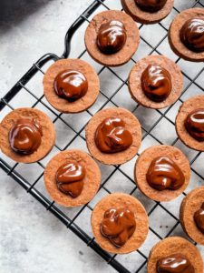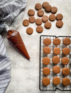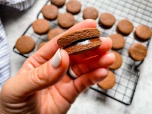 Once they all have their filling, gently press their “tops” on. Be careful to evenly press down, so the ganache spreads out evenly toward the edges. Let the cookies sit on the cooling rack for about 20 minutes or until the ganache sets and they feel firmly sandwiched together.