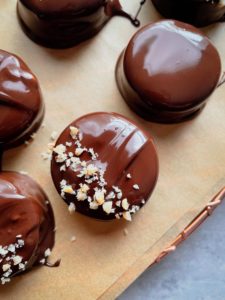 Dip each sandwich cookie into the chocolate and use a fork to flip the cookie until all sides are coated lightly in melted chocolate. Pick the dipped cookie up with the fork and allow the excess chocolate to drip back into the bowl. Transfer the dipped cookies onto a parchment lined plate.