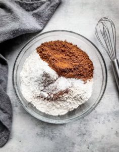 - In a medium bowl, combine 2 cups of all purpose flour, 2/3 cup of unsweetened cocoa powder, 1 cup of cornstarch, 1 teaspoon of espresso powder, 1 teaspoon of baking powder and 1/2 teaspoon of salt and set aside for now