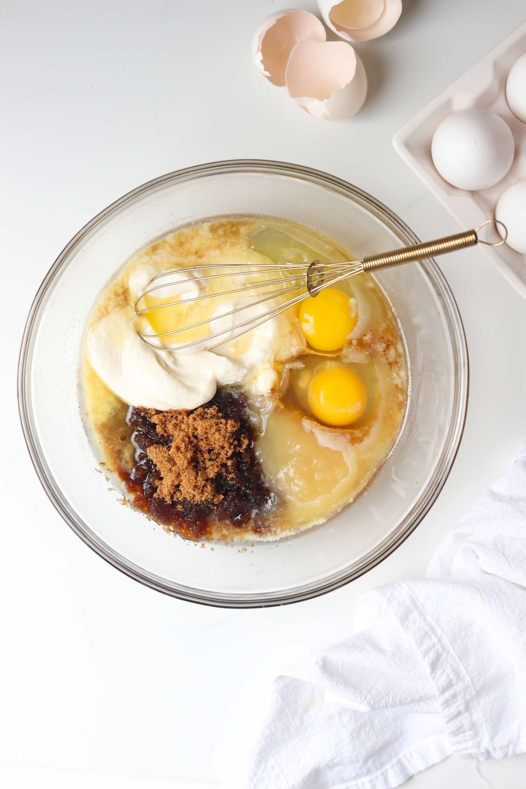 Begin by combining 8 tablespoons of melted butter with 2 large eggs, 3/4 cup of brown sugar, 1/2 cup of greek yogurt or sour cream, 1/4 cup of apple sauce and 2 teaspoons of vanilla extract.
