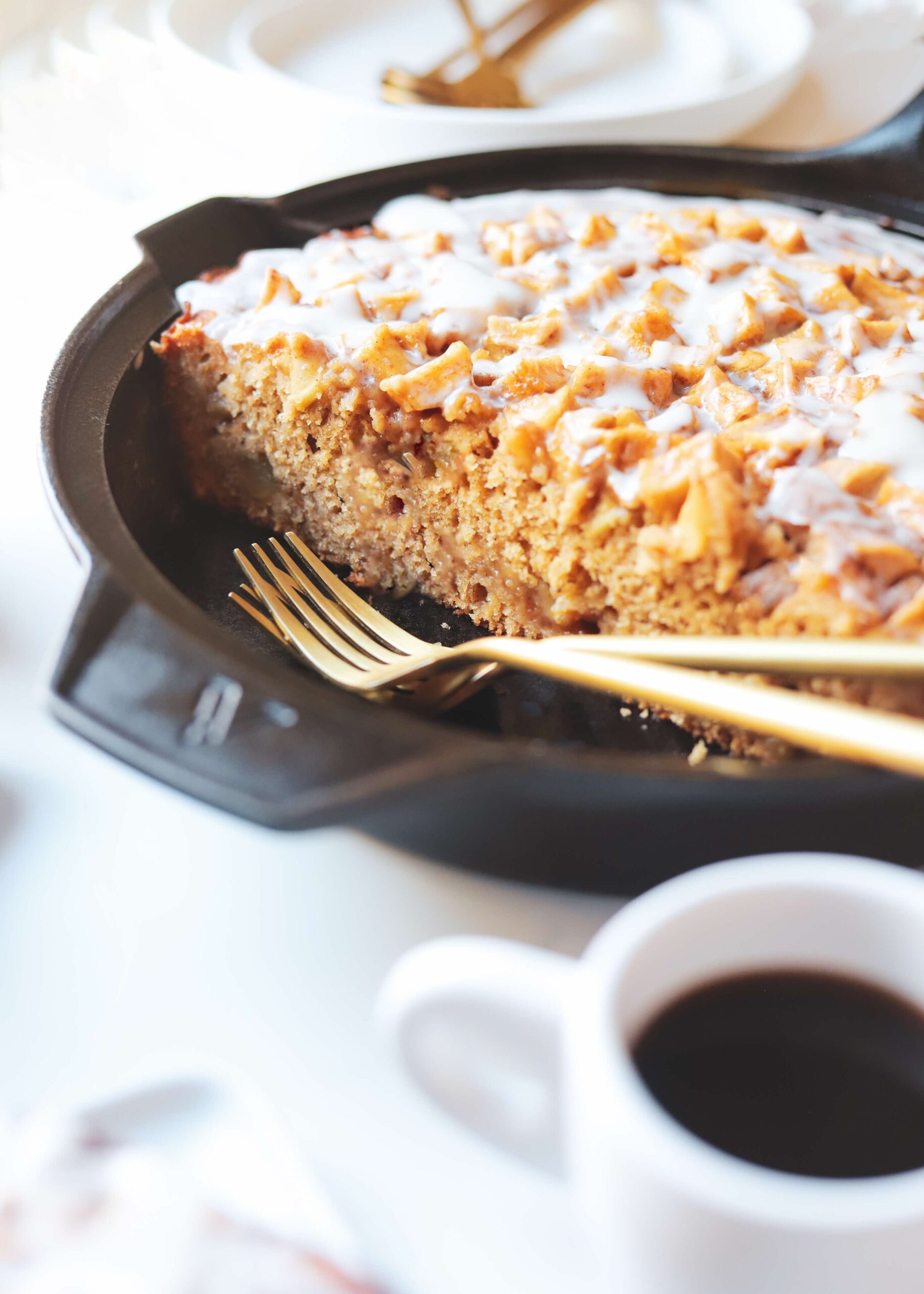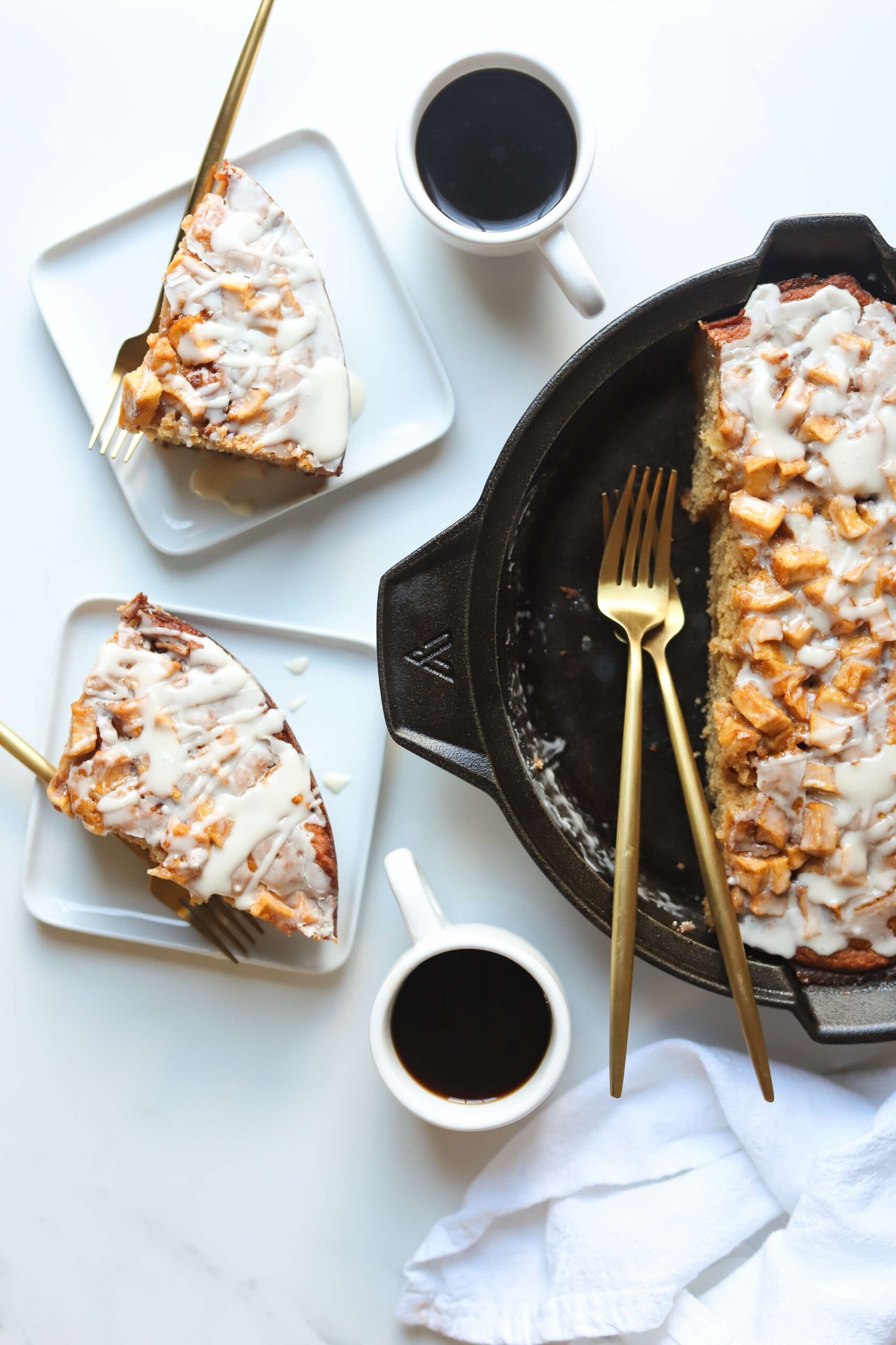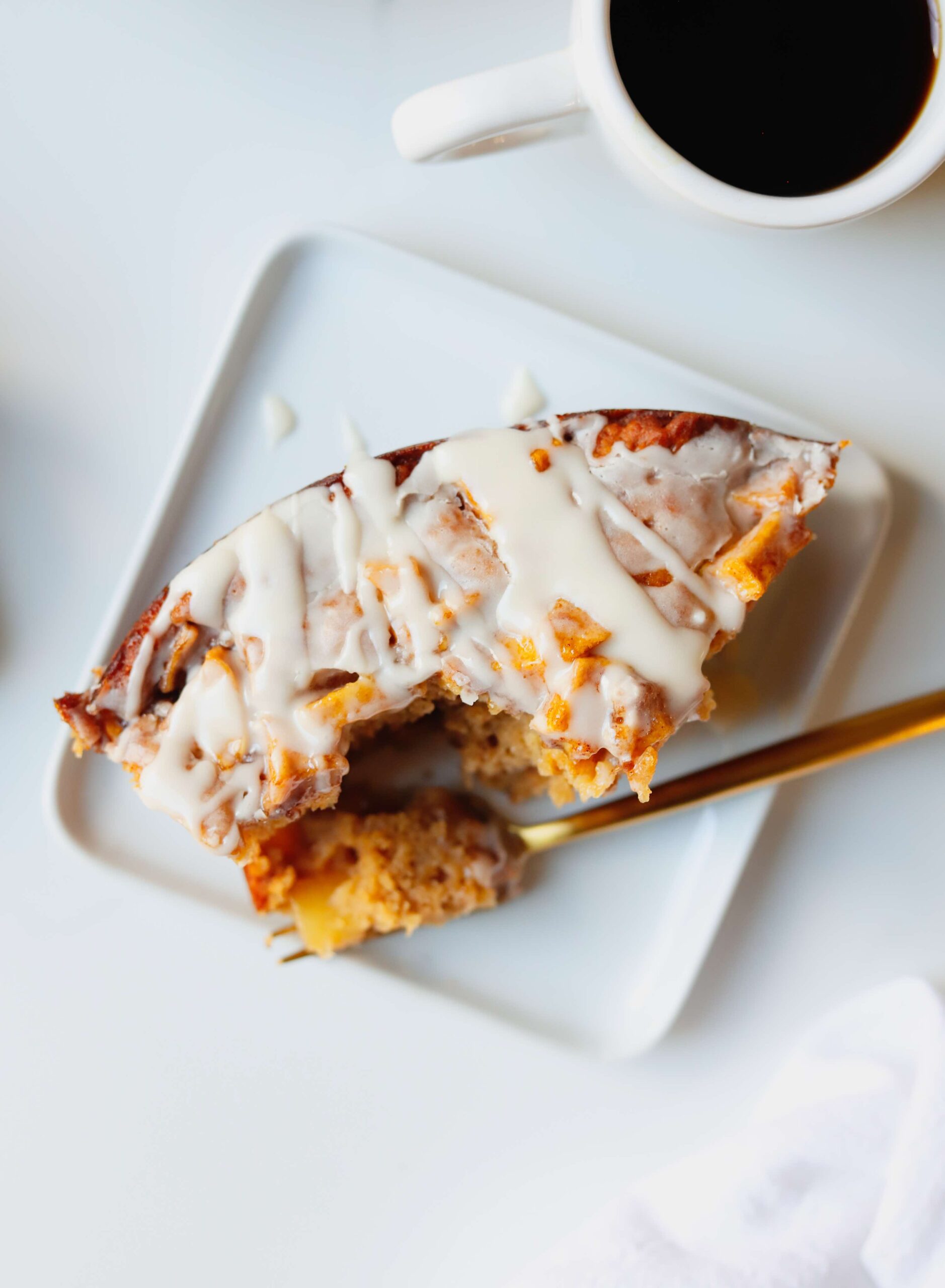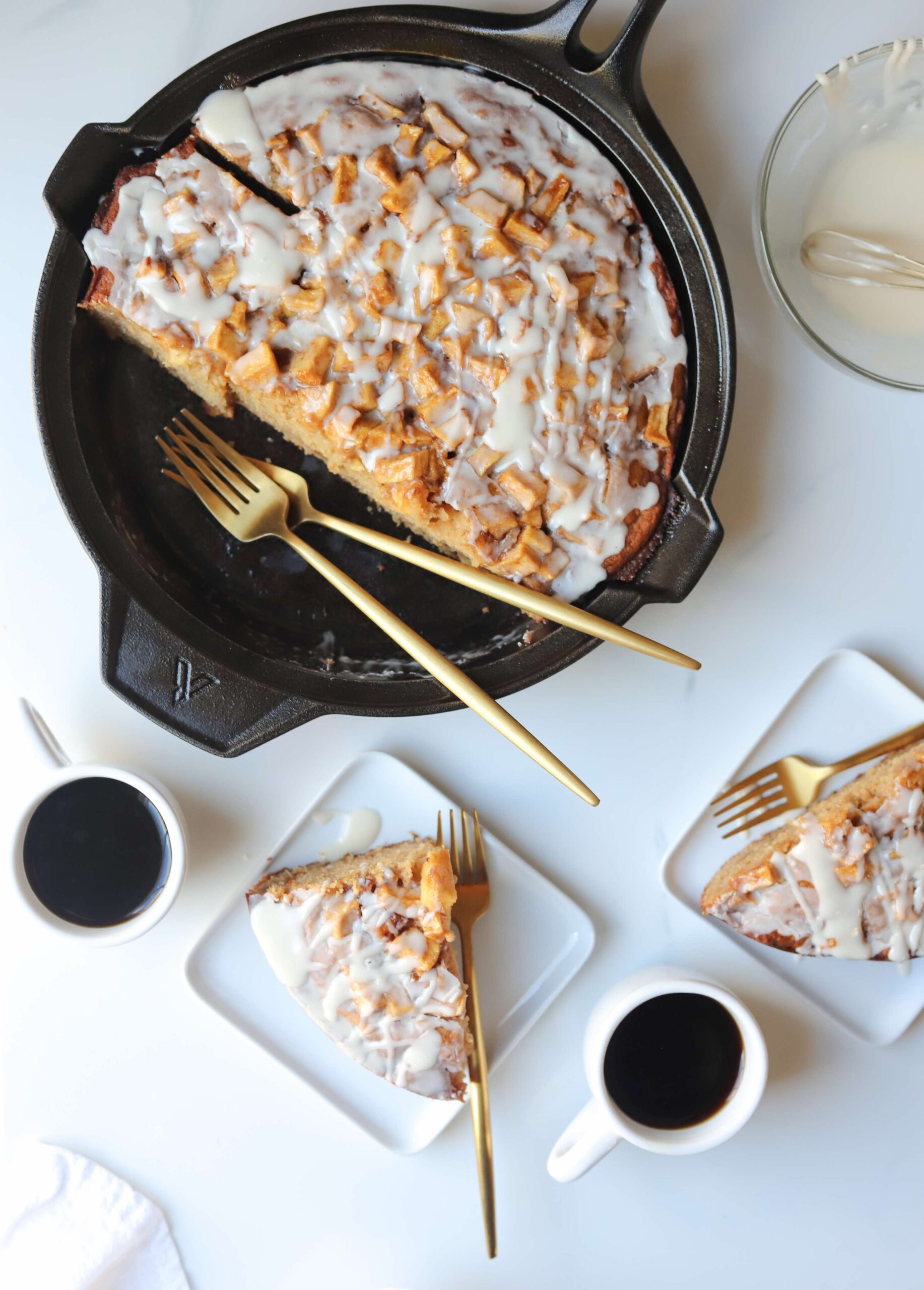 A soft, warmly spiced vanilla cake batter layered with spiced apples and drizzled with an apple cider glaze. It’s warm, inviting and gives all of those apple fritter vibes that we love.