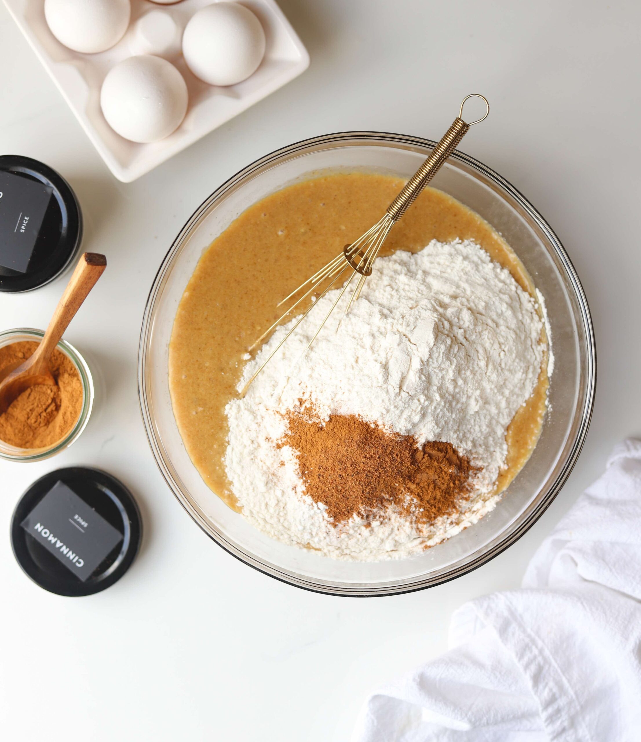 Once the wet ingredients are fully combined, add 2 cups of all purpose flour, 1 teaspoon of baking powder, 1/4 teaspoon of baking soda, 1/2 teaspoon of salt, 1 teaspoon of ground cinnamon and 1/2 teaspoon of nutmeg and mix until just combined.