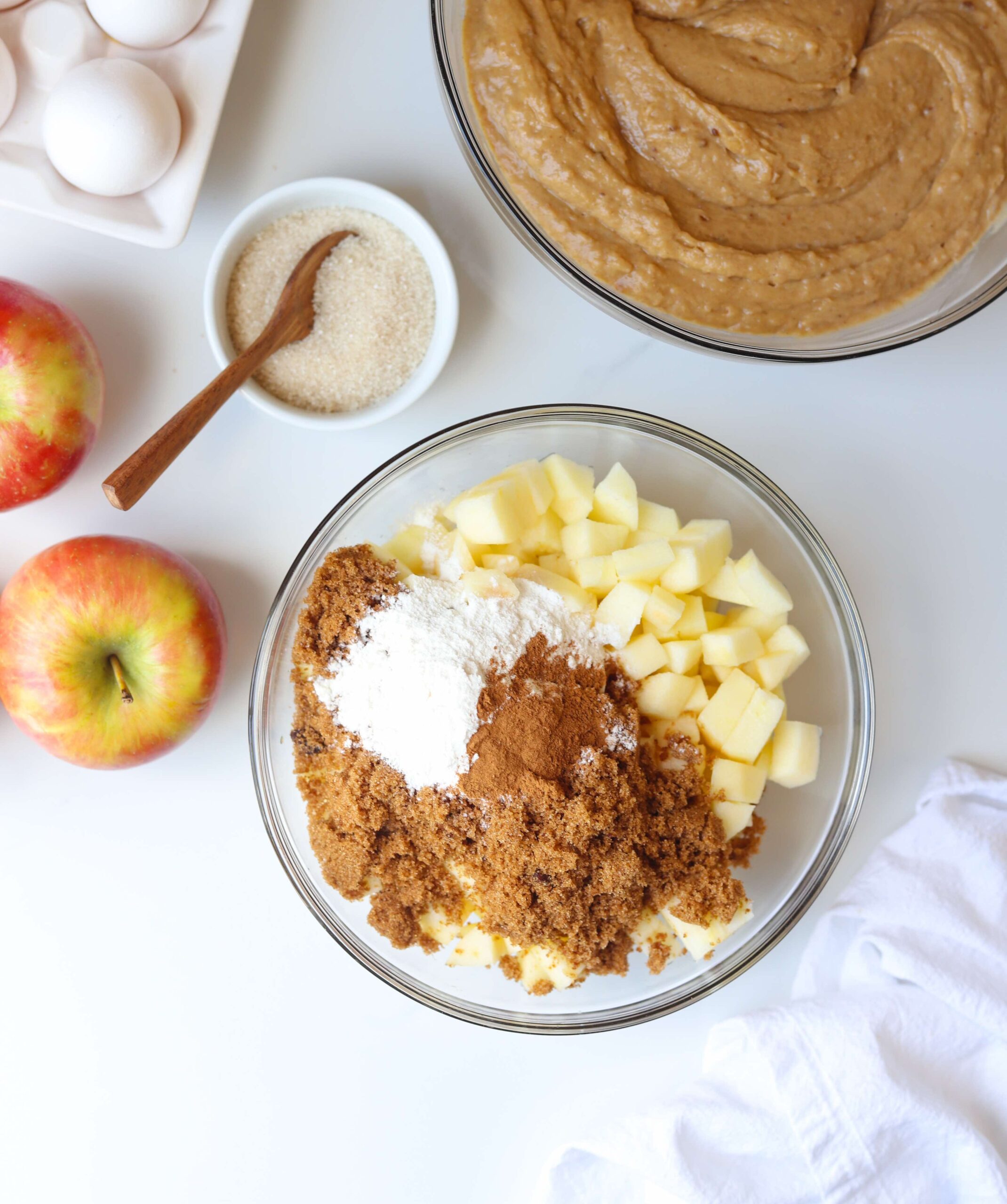 - Spread half of the apples over the batter and cover the apples with the remaining batter