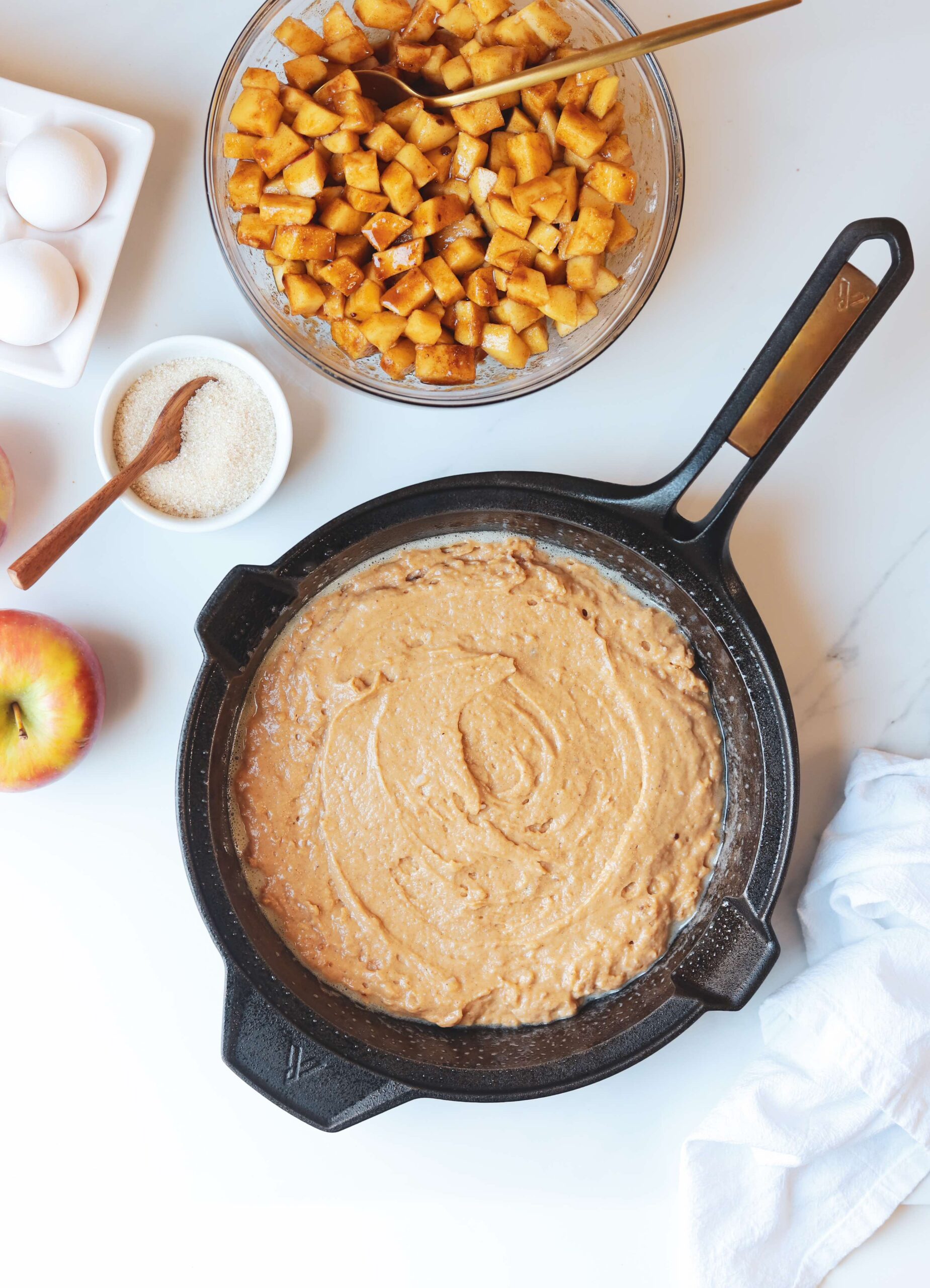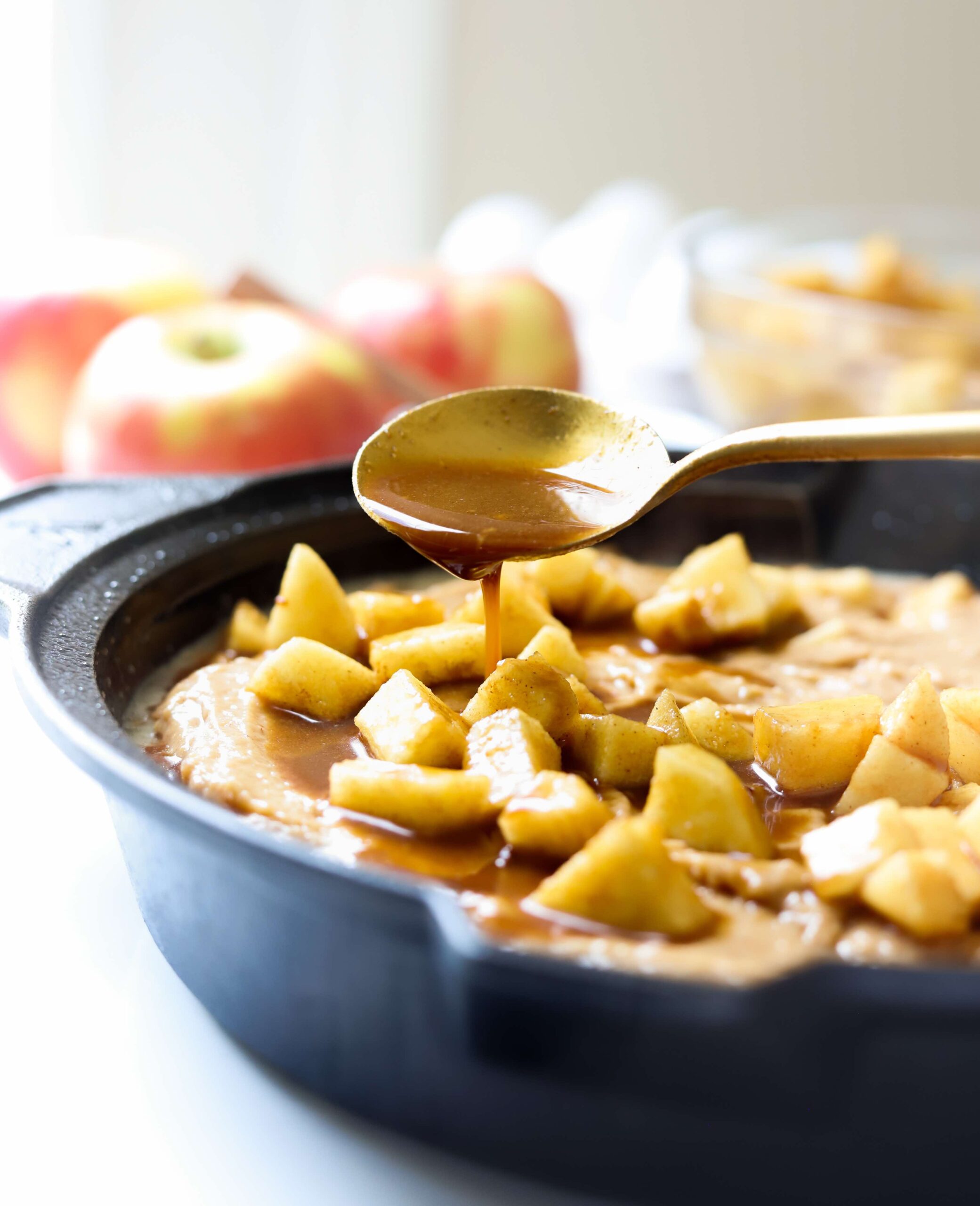 Generously grease a 9″ or 10″ baking dish or oven safe skillet. Add half of the cake batter into the baking dish and then add half of the apples over top of it…