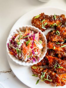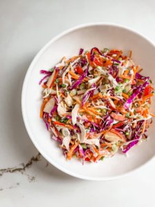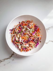 I love a good crunchy slaw. Crisp, refreshing vegetables (or fruit!) tossed in a light tangy dressing adds the perfect bite to so many dishes. Although slaws are typically thought of as a barbecue or cook out side dish, I think they should be served year round! Why not? They are easy, flavorful and pair perfectly with everything from fish tacos to turkey sandwiches and roast chicken to meatloaf.