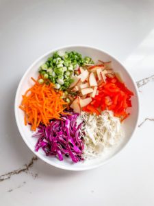 - Combine the thinly sliced apples, red bell pepper, carrots, cabbage and spring onions in a large bowl