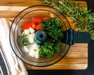 The heart of this dish is the seasoning added to the lamb and this begins by combining 1 small yellow onion, 1 small tomato, 4 cloves of garlic, 1/3 cup of fresh parsley, 1/3 cup of fresh dill and 1 tablespoon of fresh rosemary in a food processor. Pulse until everything is fully incorporated and fine in texture. Transfer this mixture into a large bowl using a slotted spoon. Press as much of the liquid out of the mixture as you can and discard it.