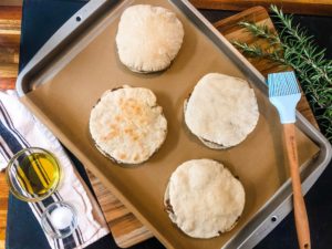 Top each pita with its matching half and place the filled pitas onto a parchment lined baking sheet.