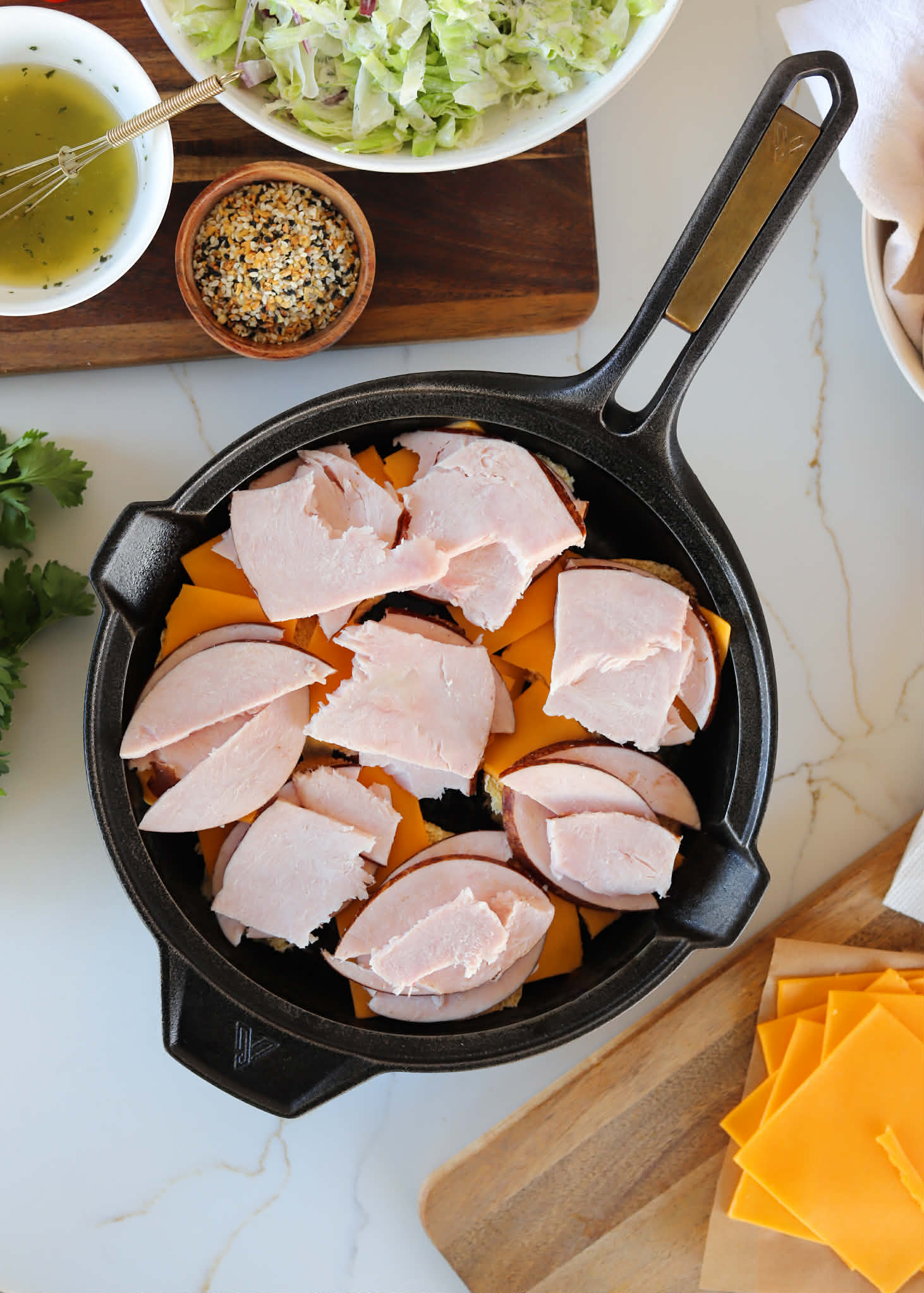 The best way to assemble your sliders is in a cast iron skillet or your favorite oven safe skillet. Start by adding your bottom buns in a single layer, top with a slice of sharp cheddar, some turkey, bacon and another slice of cheese.