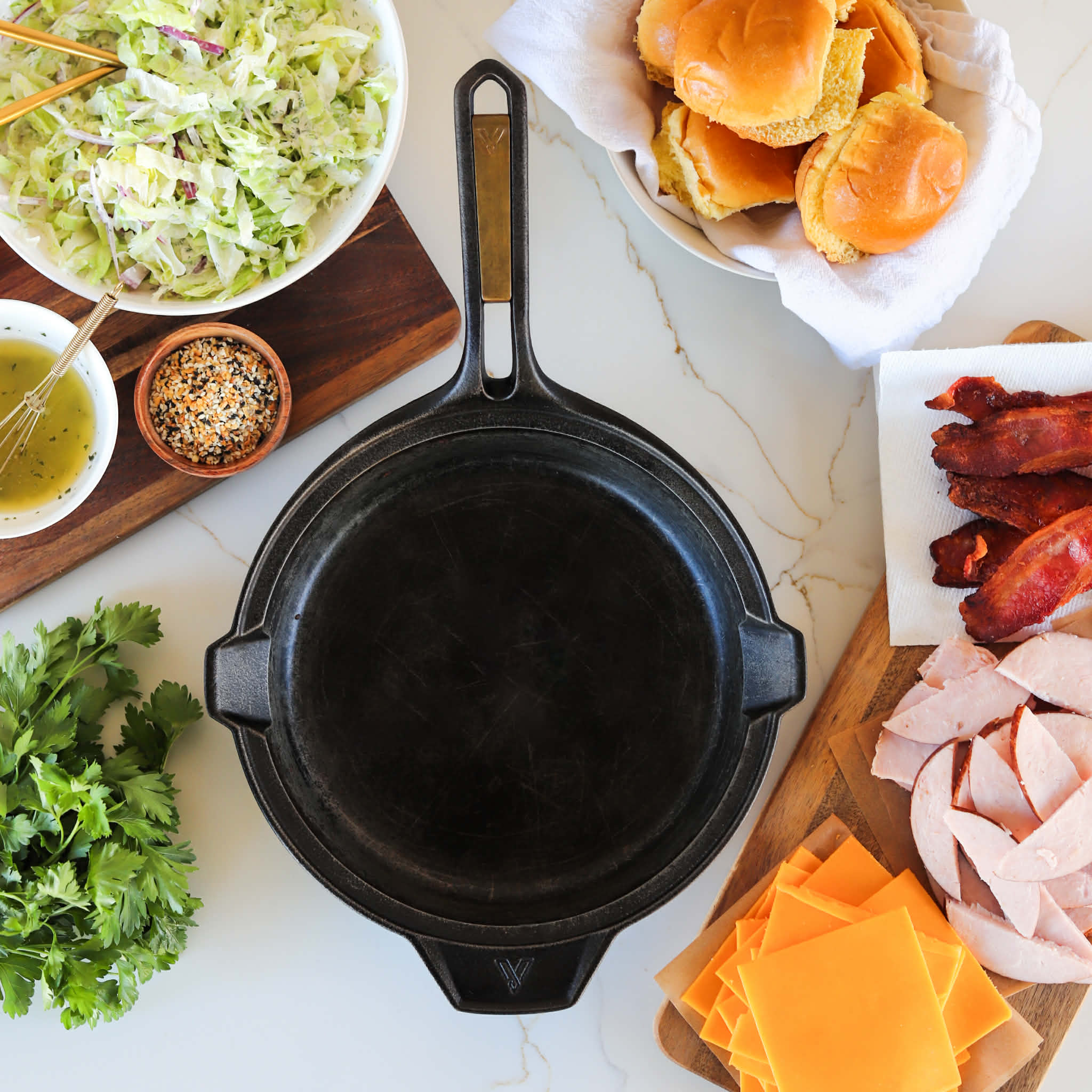 - While the sliders are baking, combine 1/4 cup of mayonnaise, 2 tablespoons of sour cream or greek yogurt, 1/4 teaspoon of garlic powder, 1/4 teaspoon of onion powder, 1/4 teaspoon of salt, 1/2 teaspoon of dried dill, 1/2 teaspoon of dried parsley, 1/2 teaspoon of dried chives, a few cracks of black pepper and a tablespoon of white vinegar in a large bowl. Add 2 cups of shredded iceberg and 1/4 cup of very finely sliced red onion and toss until everything is combined