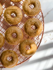 Bake the doughnuts in a 350 degree oven for about 8 minutes. If you are using a mini doughnut pan, they will be ready closer to 6 minutes and large doughnuts will be ready around 11 minutes in. They are done when they feel springy to a light touch. As soon as the first batch is done, flip the doughnuts onto a cooling rack and repeat the process with the remaining batter.