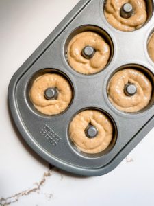 Grease your favorite doughnut pan and fill each cavity half way. You can do this with a spoon, but my favorite way of filling a doughnut pan is by adding the batter into a piping bag and piping the batter in. It keeps the edges clean and helps prevent the left over batter from drying out while the first batches bake.
