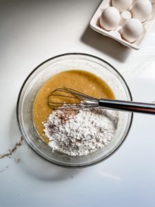 - In a mixing bowl, whisk 2 tablespoons of melted butter with 1/2 teaspoon of vanilla extract