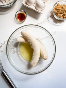 Begin by melted 3 tablespoons of butter in a microwave safe mixing bowl. Peel the bananas and add them in with the melted butter. Use a stiff fork to mash the bananas until they are nice and smooth. Add an egg and 1 teaspoon of vanilla extract and whisk to combine.