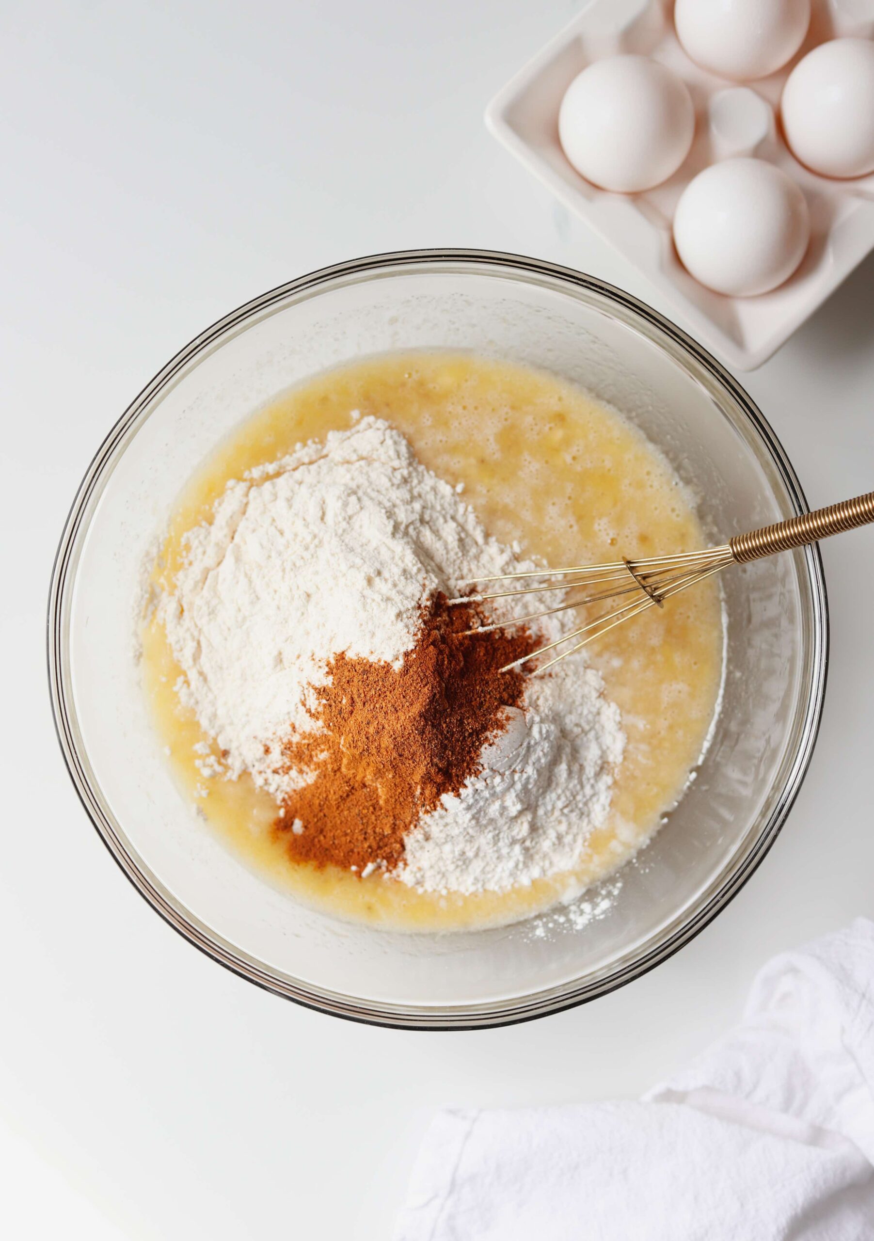 Next, add 1 1/4 cups of all purpose flour, 1 teaspoon of baking powder, 1/2 teaspoon of baking soda, 1/2 teaspoon of salt, 1/2 teaspoon of ground cinnamon and 1/4 teaspoon of nutmeg and mix until just combined.