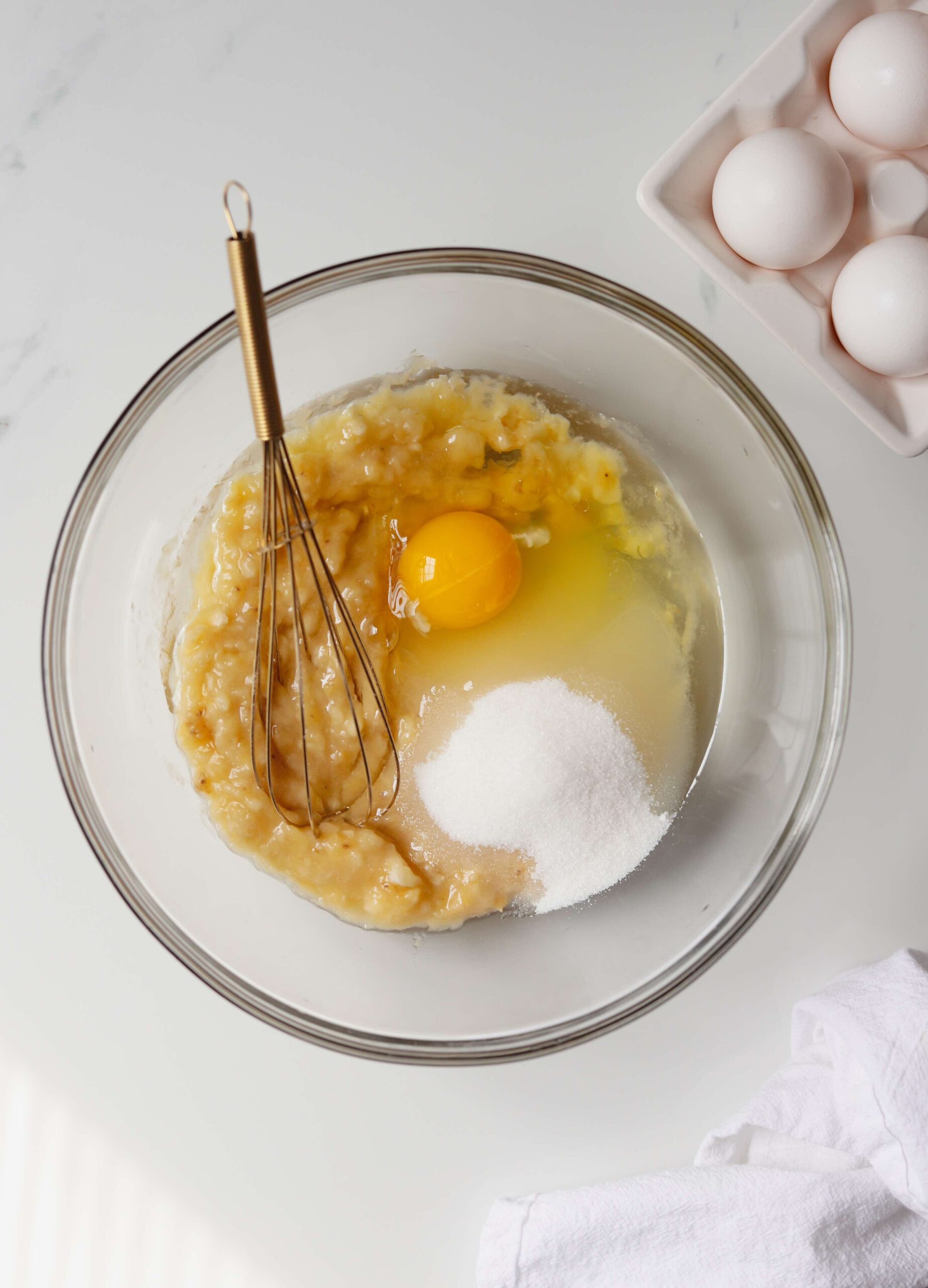 Add 1/2 cup of sugar (granulated, coconut or raw), a large egg, 1/4 cup of vegetable oil and a teaspoon of vanilla extract and whisk until combined.
