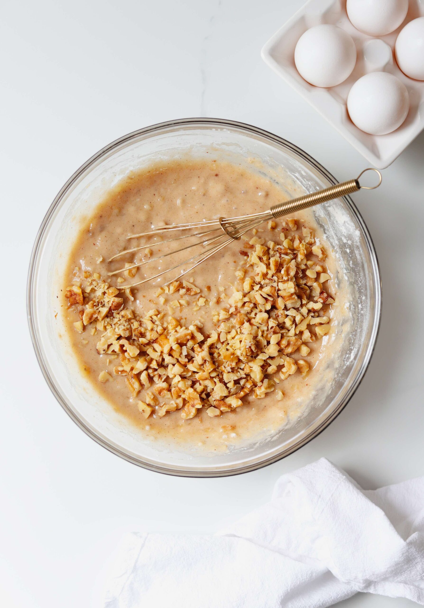 - Add 1/2 cup of chopped walnuts or pecans and mix until evenly distributed