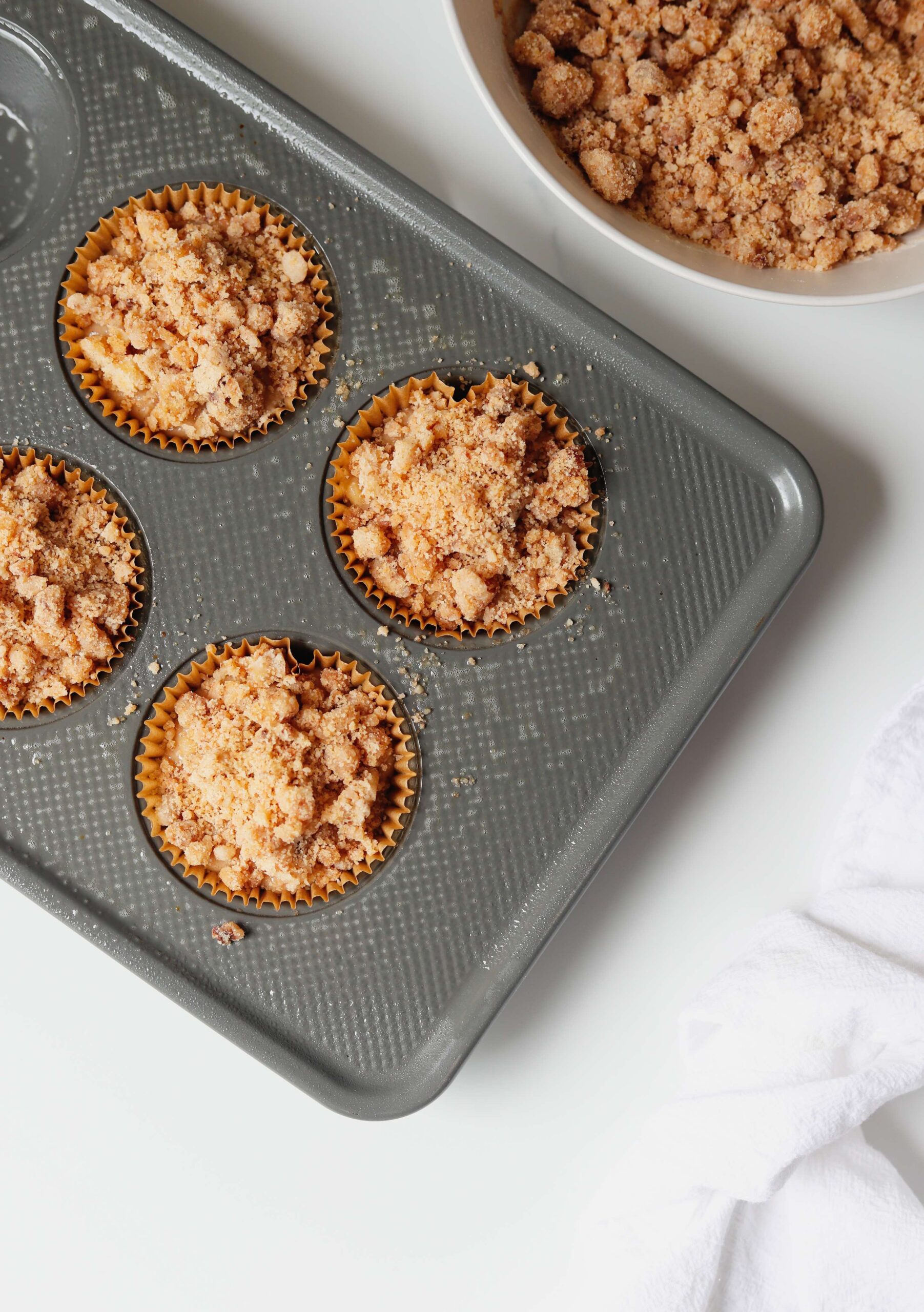 - Divide the streusel topping over the muffins gently pressing down a bit to help the streusel attach to the batter