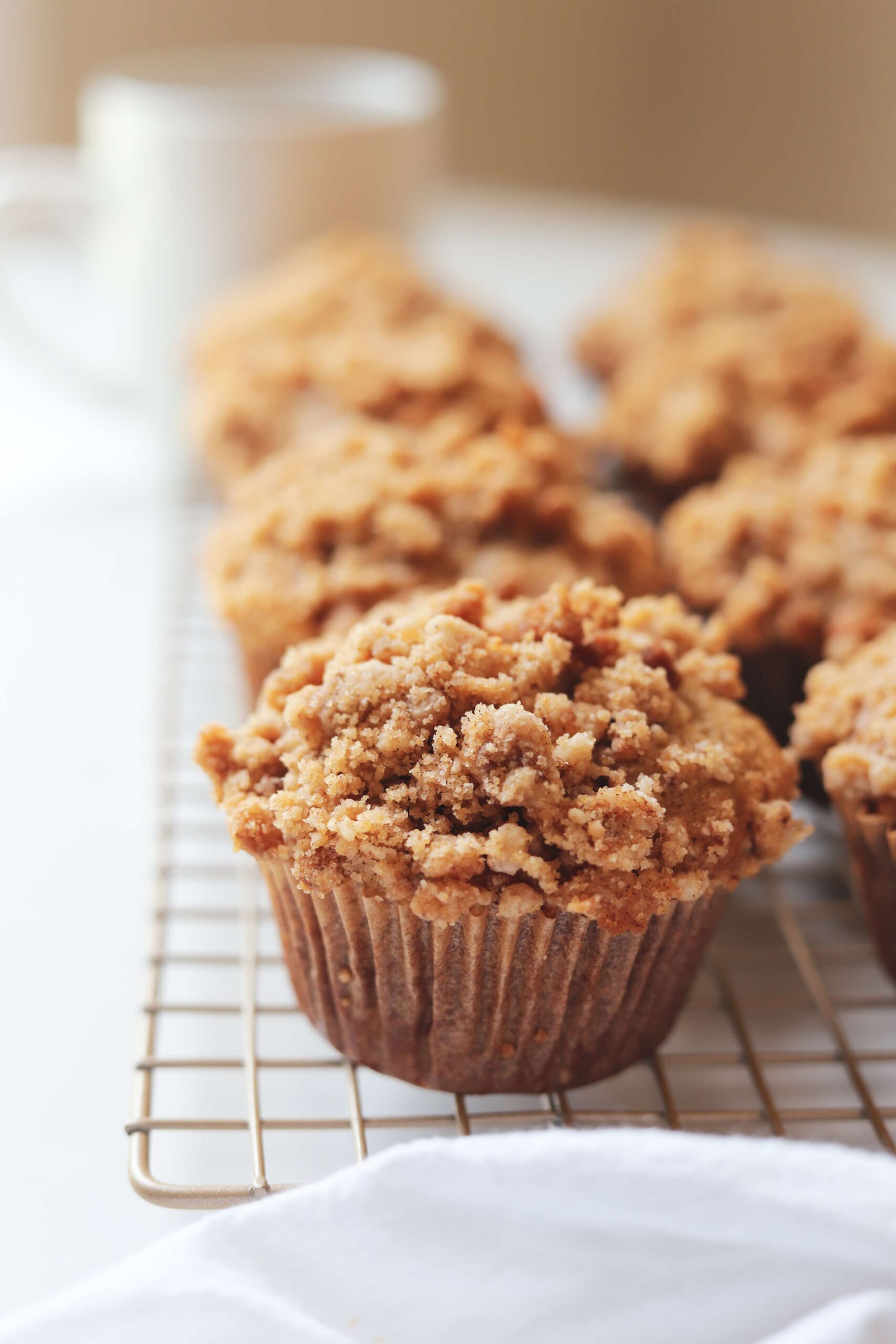 This streusel is super easy! Just combine 3/4 cup of all purpose flour, 1/3 cup of brown sugar and a teaspoon of ground cinnamon and then mix in 4 tablespoons of melted butter until you have a crumbly, wet sand like consistency. Set it aside to rest until the muffin batter is ready to go.