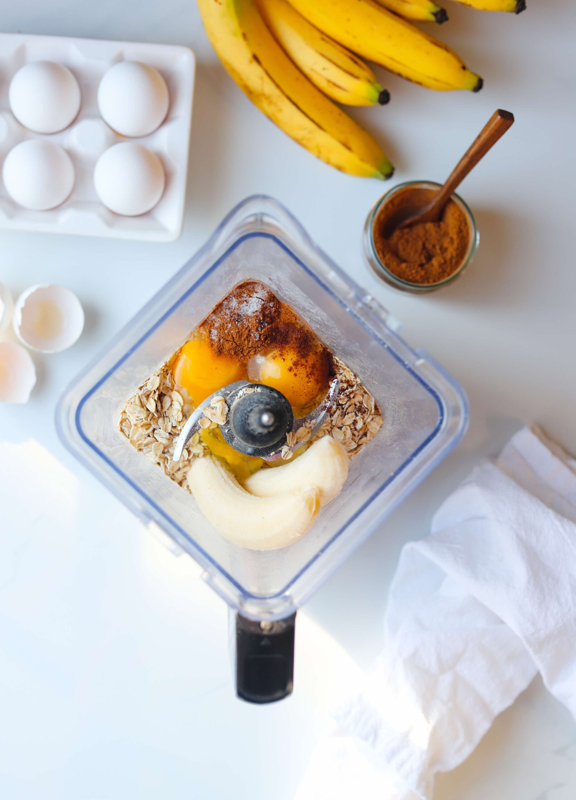 You will need 2 large very ripe bananas (the more ripe, the better!), 2 large eggs, 1/3 cup of almond milk, 1 teaspoon of vanilla extract, 1 1/4 cups of old fashioned oats, 1 1/2 teaspoons of baking powder, 1/2 teaspoon of ground cinnamon and a pinch of salt and cloves. The cloves are optional, but I love the warm spicy goodness it adds to these pancakes.