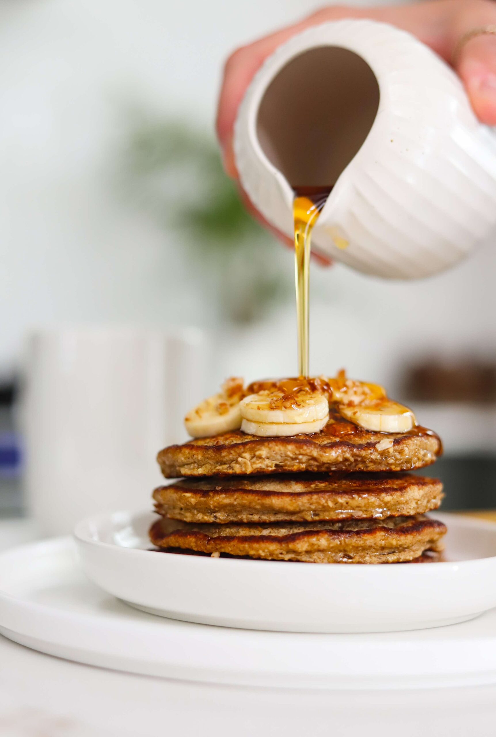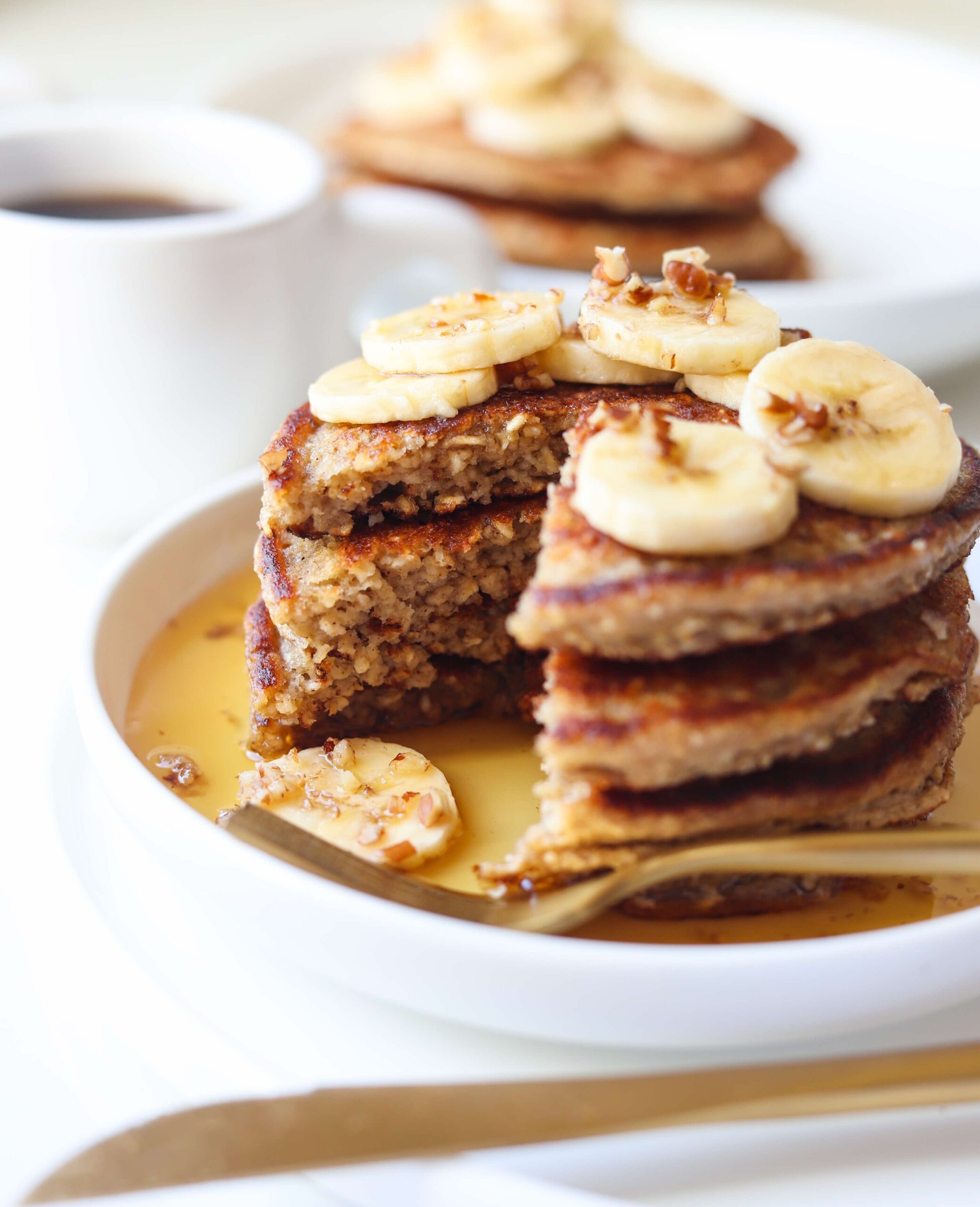 Drizzle your stack of banana oat pancakes with some maple syrup, add a little dollop of whipped cream and toss some crushed pecans or walnuts over the whole plate and prepare yourself for some truly fabulous pancakes.