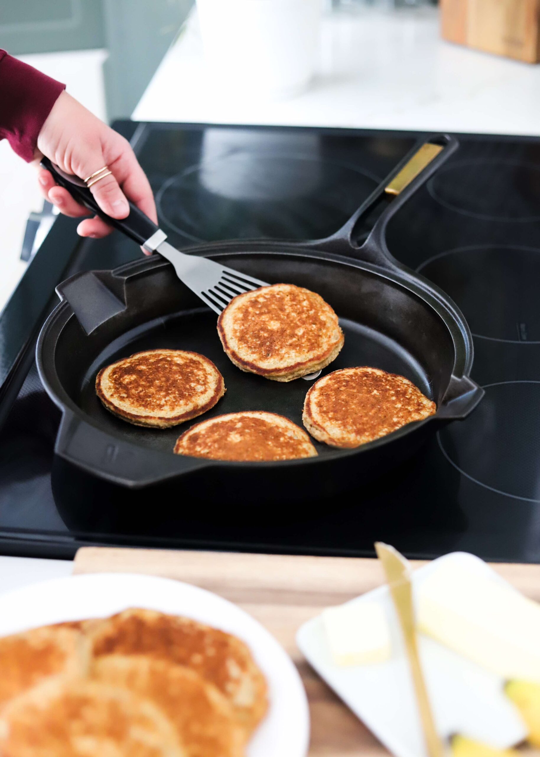 Once you see these bubbles and the outer edges of the pancakes feel slightly set, carefully flip the pancakes and continue cooking until both sides are golden brown and the middle of each pancake feels firm to a light touch.