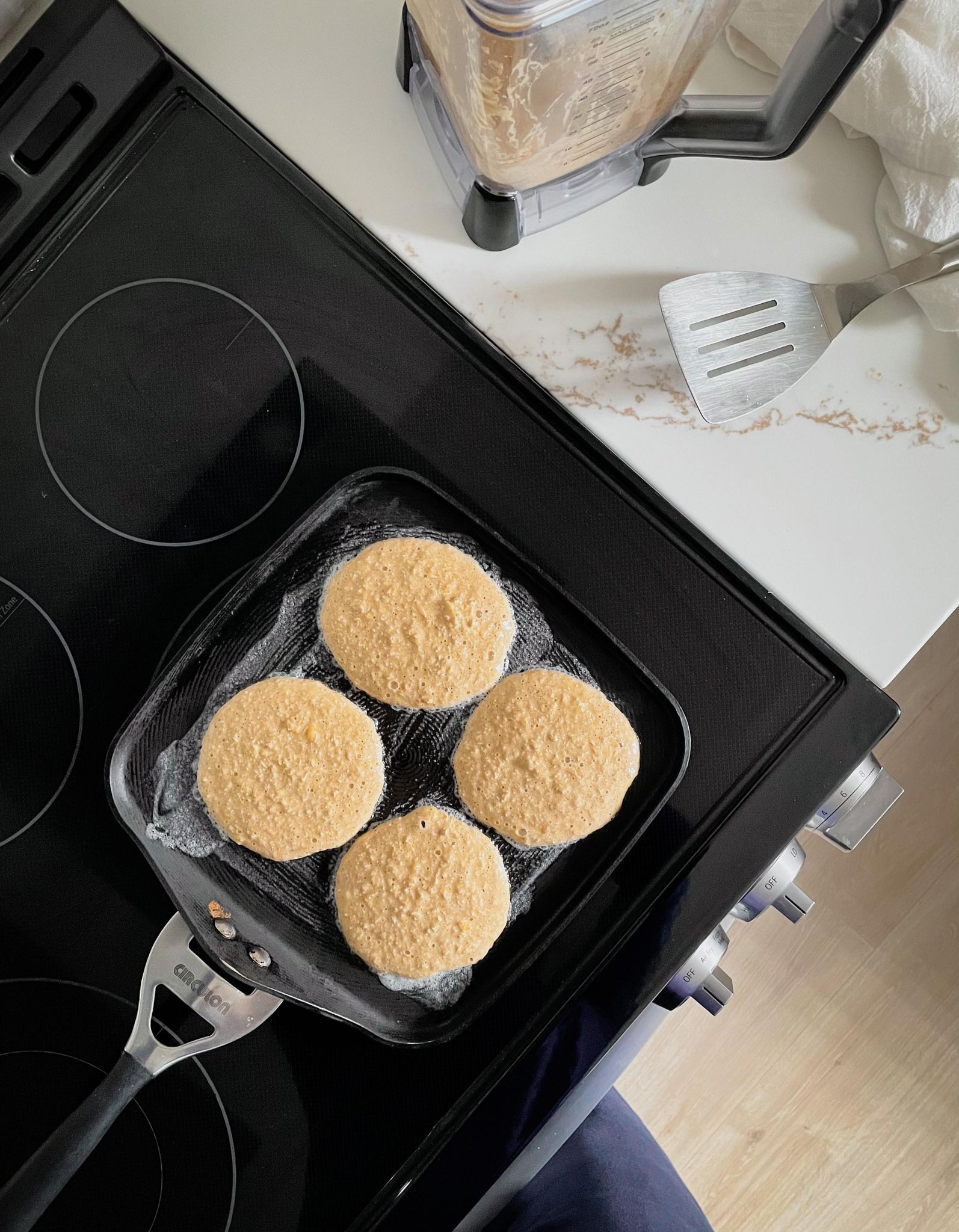 Place a flat griddle or large skillet over medium heat and let it get warm. Once the griddle is warm, spread some butter over the surface or spray with your favorite non-stick cooking spray. Add 1/3 cup of batter leaving space between each pancake and let them cook until the surface begins to form bubbles…