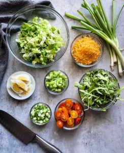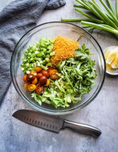 Begin by gathering some classic salad fixings. A small head of romaine lettuce sliced thin, 2/3 cup of cherry tomatoes halved, 1/2 cup of shredded sharp cheddar cheese, 2 spring onions chopped, 2 celery stalks sliced thin and 2 hard boiled eggs, peeled and quartered.