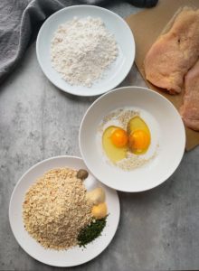 - Prepare the breading by whisking 1 large egg with 1 tablespoon of milk seasoned with salt and black pepper in a shallow bowl. Add 3/4 cup of all purpose flour in a separate shallow bowl and combine 3/4 cup of breadcrumbs with 1 tablespoon of dried parsley, 1/2 teaspoon of garlic powder, 1/2 teaspoon of onion powder, 1/2 teaspoon of salt and 1/4 teaspoon of black pepper in a third shallow bowl
