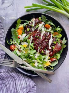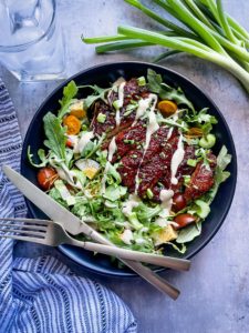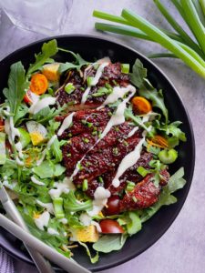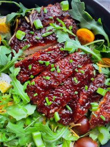 This salad is fabulous. Crispy pan fried chicken breast smothered in my very barbecue sauce over a bed of crunchy romaine and peppery arugula with sharp cheddar, hard boiled eggs, cherry tomatoes and some celery (celery and bbq chicken are bffs). All of these ingredients combine to make a really wonderful salad full of different flavors and textures… just perfect for lunch or dinner.