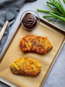 For the breading, whisk 1 large egg with 1 tablespoon of milk in a shallow bowl and season with a pinch of salt and black pepper. In a second shallow bowl, add 3/4 cup of all purpose flour and season that with salt and black pepper. In a third shallow bowl, combine 3/4 cup of panko breadcrumbs, 1 tablespoon of dried parsley, 1/2 teaspoon of garlic powder, 1/2 teaspoon of onion powder, 1/2 teaspoon of salt and 1/4 teaspoon of black pepper.