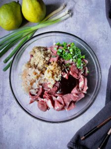- Combine 2 pounds of thinly sliced beef with 1 small peeled and grated pear, 1/3 cup of soy sauce, 1/4 cup of brown sugar, 3 tablespoons of toasted sesame oil, 5 cloves of finely minced garlic, 1 inch of grated ginger, 2 tablespoons of gochujang, 1 tablespoon of rice wine vinegar and 2 chopped green onions